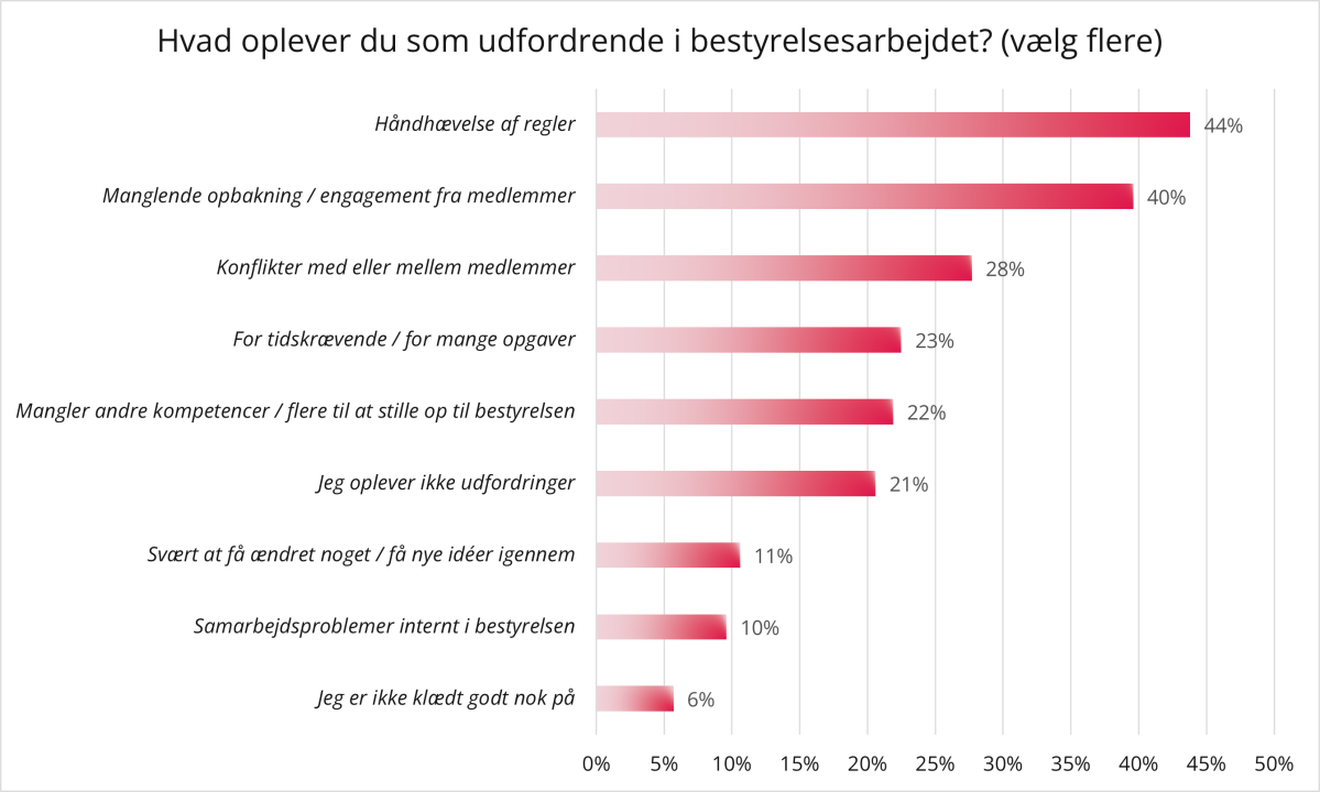 I følge de besvarelser, vi har modtaget, peger de frivillige bestyrelsesmedlemmer på primært tre store udfordringer i bestyrelsesarbejdet: