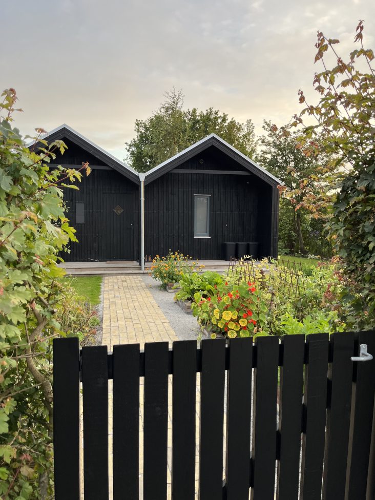 Sort træbeklædning, store vinduespartier og rene linjer kendetegner Emma og Kaspers selvbyggede kolonihavehus ‘Fryd’.