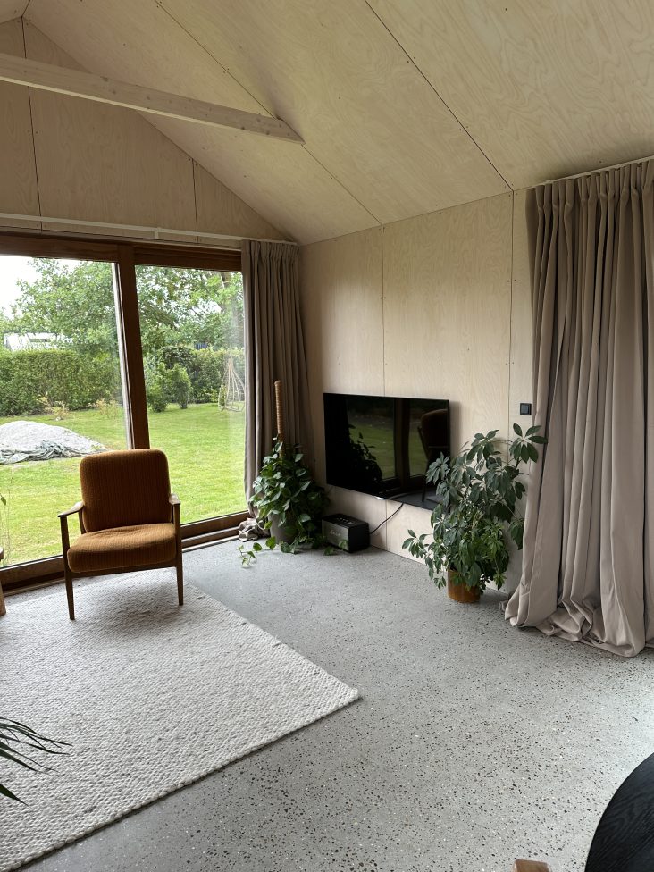 Kolonihavehuset emmer af lys og varme med flot terrazzogulv og birkefinér, der dækker alle indervægge, loft og genbrugskøkkenet.