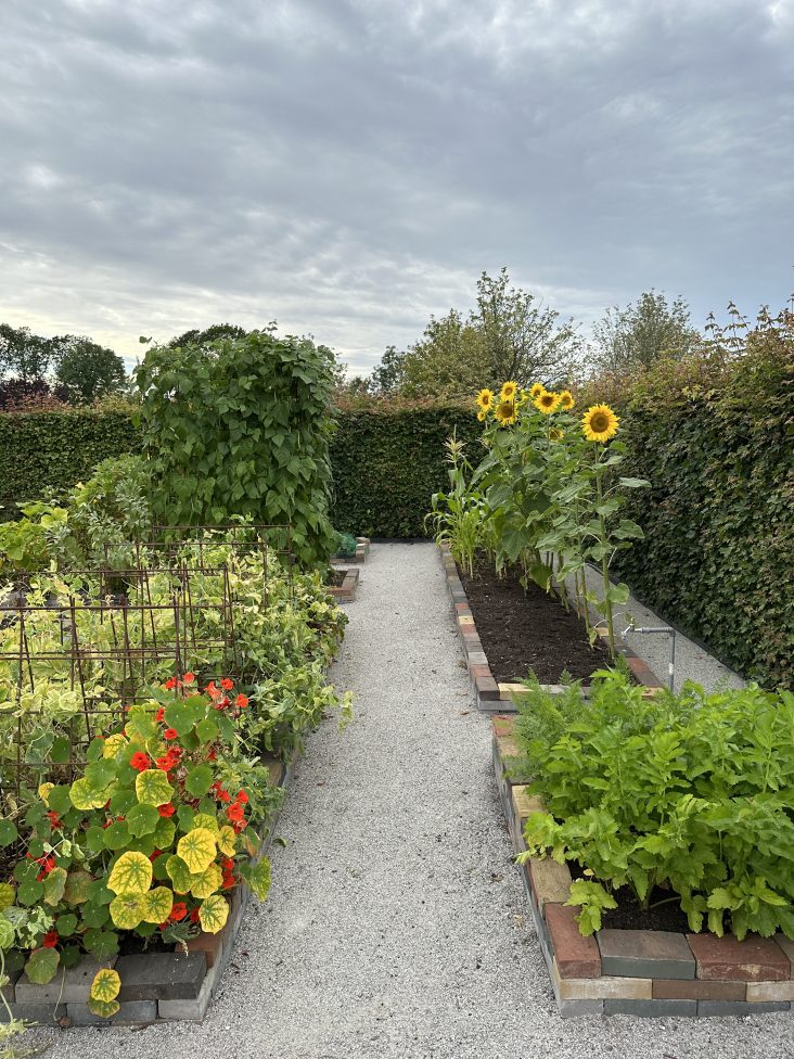 Foran huset vokser en farverig køkkenhave frem, anlagt i højbede bygget af mursten doneret fra en workshop. Her spirer sommerens afgrøder side om side med drømmen om et fremtidigt hjemmelavet drivhus.