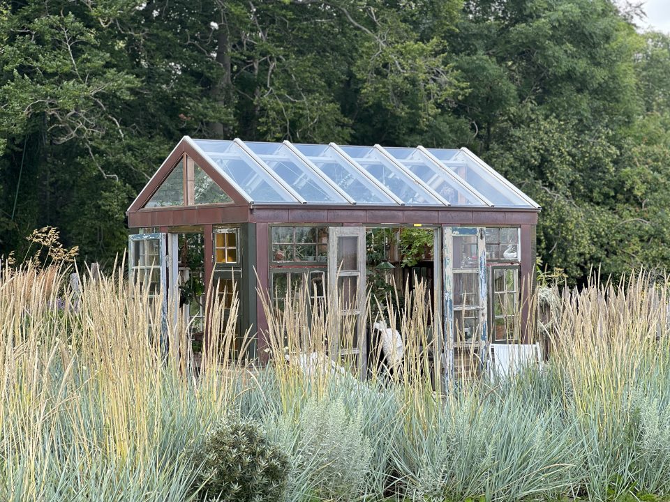 Drivhusets og havens ejerinde Anja Sohne fortæller stolt, at hun og hendes mand har bygget drivhuset af materialer, som de reddede fra at blive smidt ud. Anja er passioneret for genbrug og for smukke, patinerede materialer, som hun oplever ofte er i langt bedre kvalitet end dem, man kan købe i byggemarkedet. For eksempel stammer mange vinduer i drivhuset fra renoveringen af parrets hus, og de er lavet af kernetræ, som man slet ikke kan købe mere – med kærlig vedligehold kan de holde hundrede år endnu.