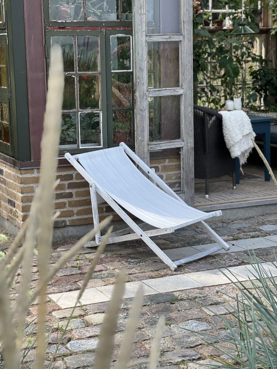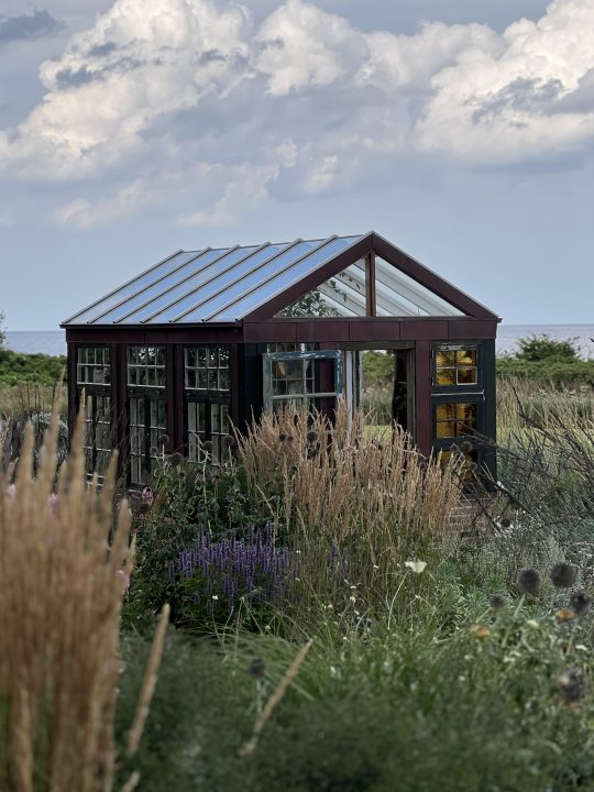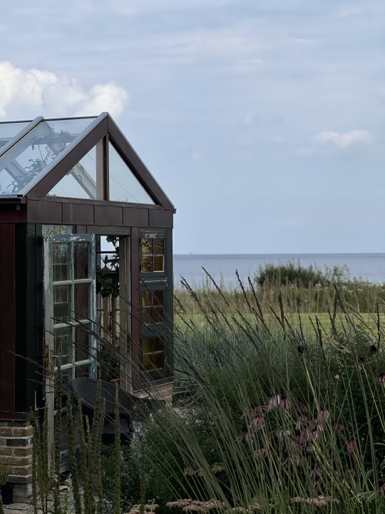 Hvor den naturlige staudehave smelter trådløst sammen med den omgivende strandeng, står et mageløst fint drivhus beklædt med det smukkeste kobber og indrettet som en hyggelig oase. Huset er skabt af to mennesker, hvis hjerte banker for genbrug og gode byggematerialer, to entusiastiske tingfindere med sans for æstetik og naturens farver. Her er skabt et rum til at dyrke det grønne og til at betragte naturens sceneri – og samtidig nyde en hyggestund i drivhusets hyggeligt knitrende kurvestole eller sofa. Lidt magelighed må der til.