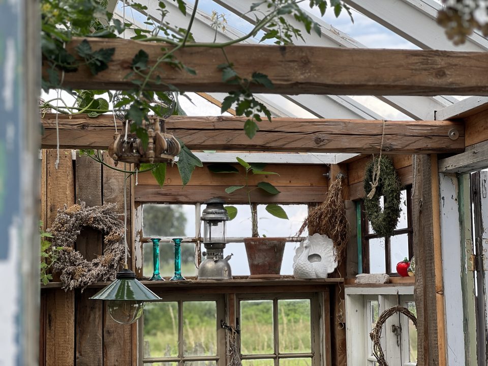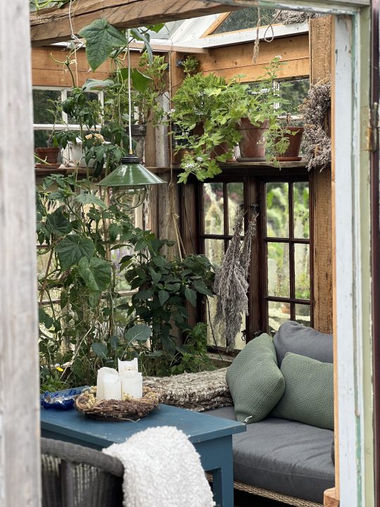 I drivhuset er der først og fremmest plads til mennesker og til hyggeligt samvær. Man taler så godt sammen, når man er omgivet af planter. Foruden levende planter bliver der tørret blomster og dekorative frøstande fra haven og stranden. Af dem binder Anja kranse og laver buketter, som udsmykker have og drivhus. De håndlavede ting bidrager i den grad til stedets charme. Her er virkelig skabt et sted til nytte og nydelse, og et sted hvor naturen på alle årstider kan betragtes og tages helt ind – det giver nemlig sjælero, afslutter Anja.