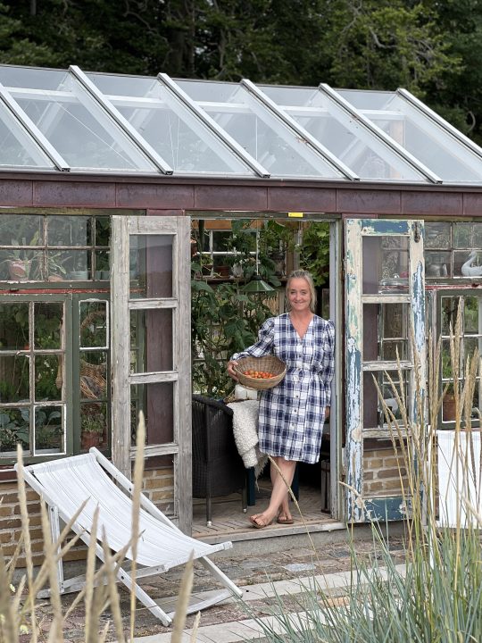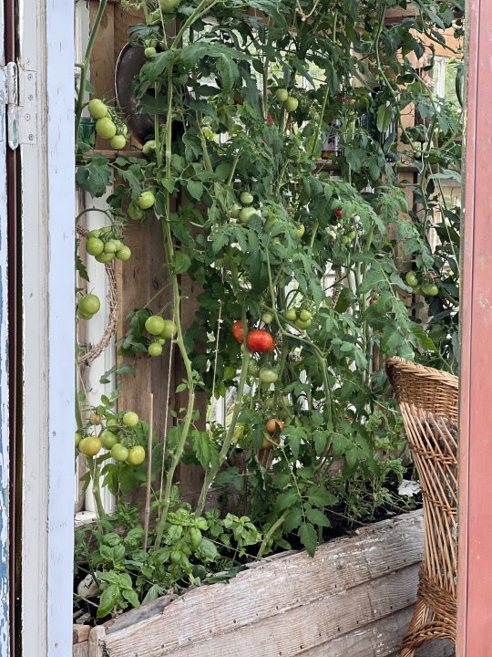 Anja øver sig i at blive en rigtig plantedame med viden om havens og drivhusets planter. I år er det gået over al forventning med tomaterne, som slynger sig på hjemmelavede stativer. Mindre godt er det gået med agurker og chili, men al læring har en begyndelse, og så kan der blot prøves igen til næste år. Drivhusets mange frodige planter vokser i kapilærkasser, som er skjult af siden fra en gammel robåd. En fantasifuld og praktisk løsning.
